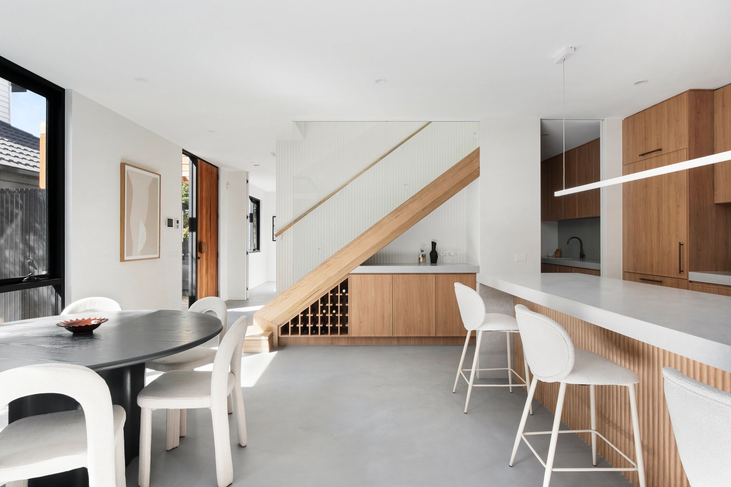 Internally, the two dwellings were given distinct identities. One features epoxy concrete flooring paired with timber veneer cabinetry, while the other adopts a lighter palette with oak timber flooring and soft matte grey cabinetry.