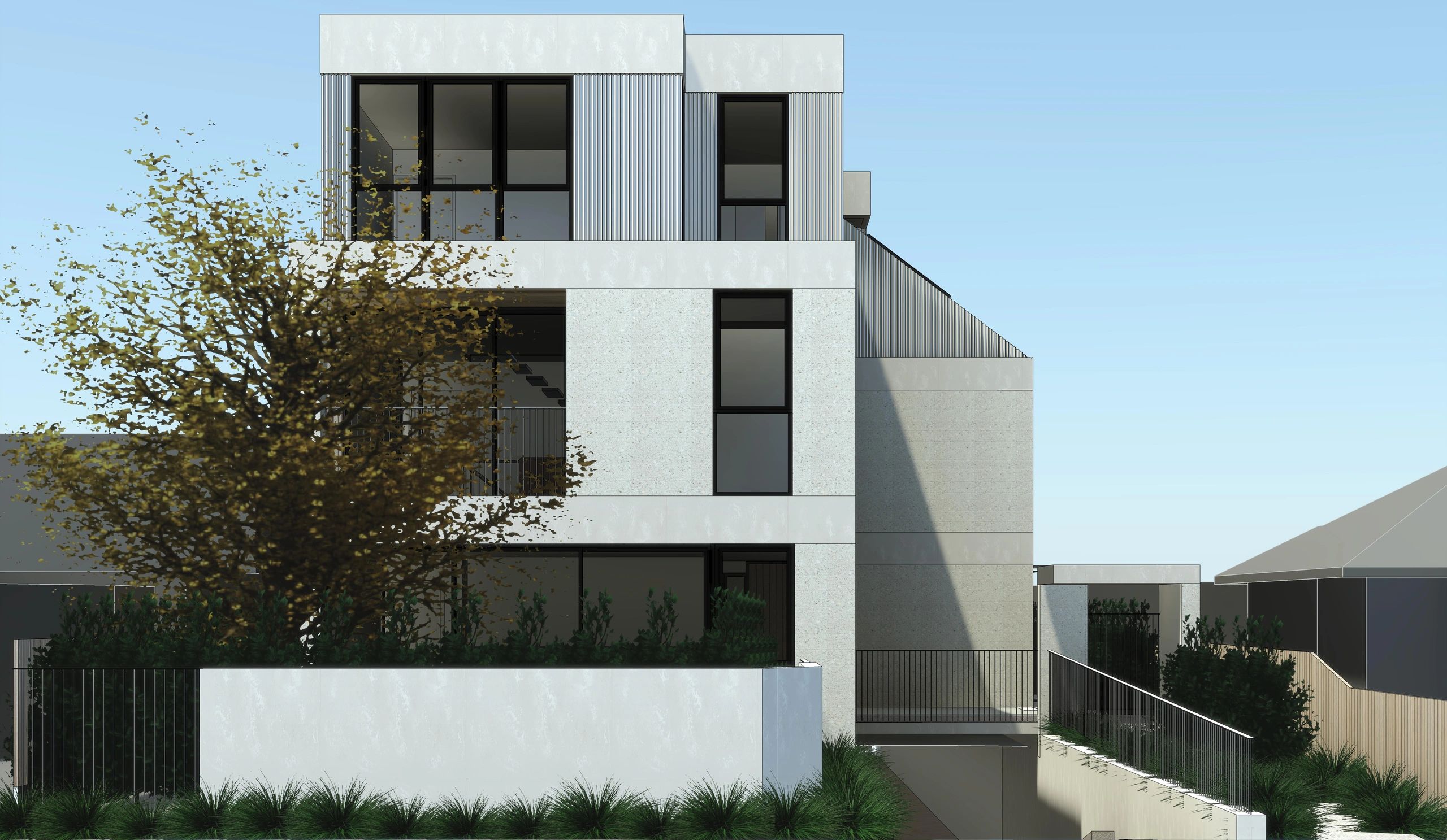 The Station is a collection of eight three-storey townhouses arranged over a basement level in the growing suburb of Highett.